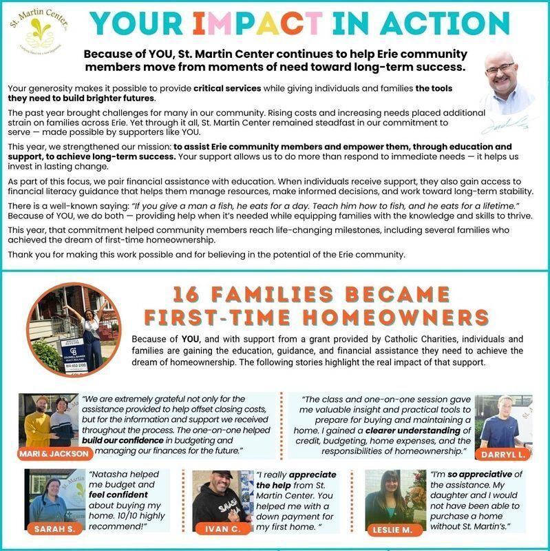 Our 2024-2025 Impact Report is here! Click the image to explore the incredible impact you've made in our community. If you'd like a printed copy mailed to you, please call 814-452-6113 x216 or email mbagnoni@stmartincenter.org.